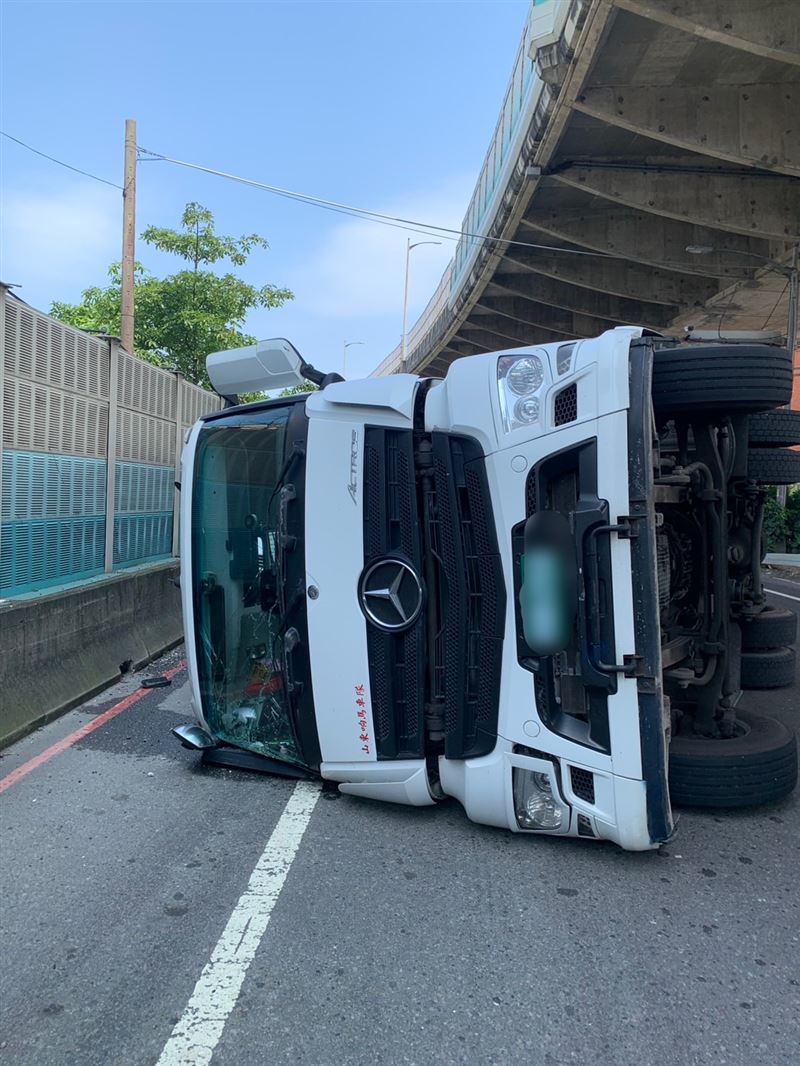 據了解,今天上午8時許,當時羅姓男子駕駛大型聯結車,沿八里區商港路行駛,行經中華路準備左轉上台64快速道路匝道時,車身疑因重心不穩或操作不當突然發生翻覆。側翻的車體不慎擦撞郭男違停在路旁的汽車,讓該車夾在水泥護欄及聯結車車體間,幸好車內當時無人。羅男翻車後自行爬出脫困,僅受驚嚇並無大礙。