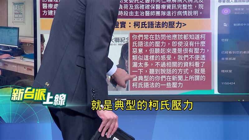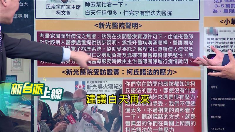 面對外界質疑,新光醫院雖發布聲明稱是考量家屬焦慮才給予協助,但文字中亦含蓄建議「家屬應於白天主治醫師巡房時再溝通」。然而,新光醫院副院長在受訪時的語氣則更耐人尋味,他表示柯文哲說話的方式就是典型的「柯氏語法」,即使沒有惡意,聽在基層醫護耳中仍感到高度壓力。