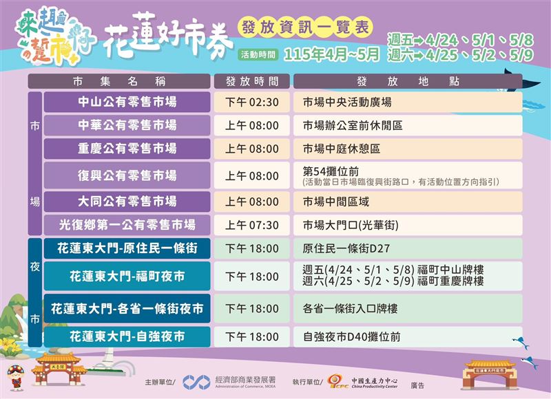 經濟部商業發展署指出,2026年4月24日至5月9日連續三週的週五、週六,都有「花蓮好市券」發放,地點包含光復鄉的第一公有零售市場;花蓮市的中山公有零售市場、大同公有零售市場、重慶公有零售市場等;還有知名的東大門夜市。