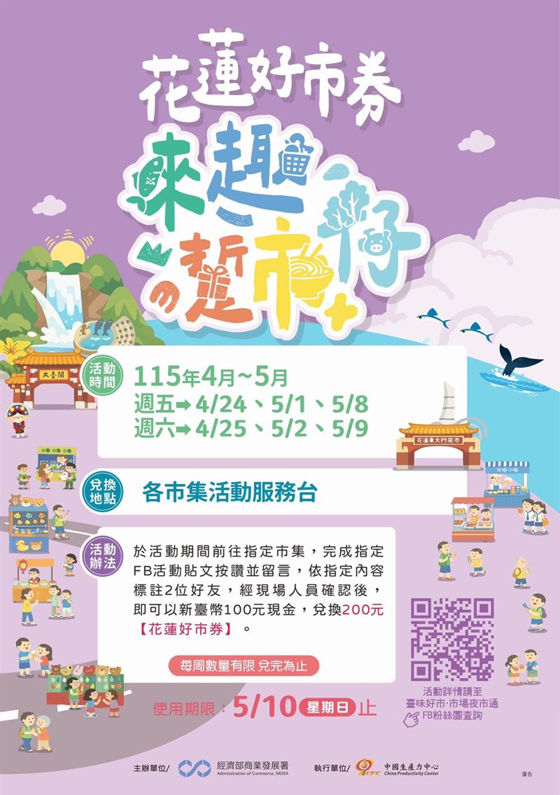 至於「花蓮好市券」的領取方式,在各市場的發放時間前往,找到市集服務台、完成主辦單位公告的社群互動任務,並經現場工作人員確認後,即可用新台幣100元現金兌換價值200元的「花蓮好市券」1份,該券能用於市場內消費,但使用期限只到5月10日;此外,「花蓮好市券」每週發放的數量也有限,兌完為止。