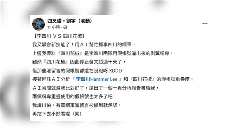 沒有特別點名,不過侯友宜話裡話外都在暗示要交棒李四川,只是現在李四川恐怕得先解決網軍爭議,因為網紅四叉貓再發文,在踢爆李四川有側翼粉專後儘管粉專10幾天都沒新動作,卻仍有網軍持續灌留言。