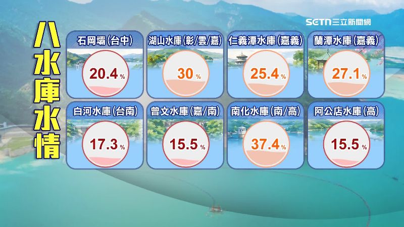 根據經濟部台灣水庫即時水情的最新統計,目前中南部有八個水庫蓄水量都在40%以下,包括石岡壩的20.4%、湖山水庫的30%,甚至曾文水庫和阿公店水庫都只剩下15.5%。
