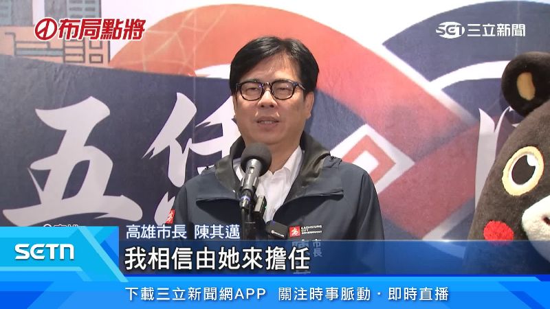 高雄市長陳其邁:「主委最重要的工作就是要輔選市長跟立委都能夠全壘打,所以責任是非常重,其實也都非常受到年輕人的歡迎,我相信由她來擔任主委的工作,那一定可以勝任,我們未來市黨部主委也可以整合民進黨的基層的力量。」