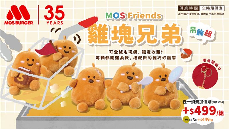 搭配春夏新品上市,MOS Order APP「MOS跨店取」另祭出嚐鮮優惠,數量有限,敬請把握。5月15日限量開賣超萌「MOS Friends雞塊兄弟」玩偶吊飾,每組售價599元,每隻玩偶均附金屬掛勾吊飾環,可作為鑰匙圈或背包點綴,或放入娃包!摩斯漢堡會員可用摩斯金點3點加價449元兌換或於店內完成任一消費,即可用加購價499元入手。