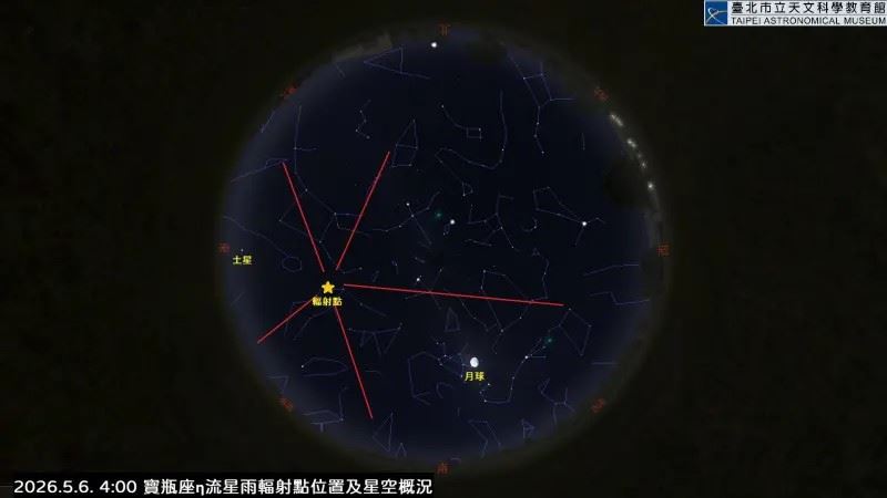 根據天文館精測,寶瓶座η流星雨的輻射點約在凌晨1時30分從東方升起,至天亮前是最佳的捕捉時段。儘管該流星雨的每小時天頂流星數(ZHR)約為50顆,屬於中等強度的年度指標流星雨,但今年的觀測條件面臨挑戰。由於極大期當晚正逢「虧凸月」,明亮的月光將盤踞地平線上方,導致原本壯觀的流星雨可能受到光害遮蔽,預估實際每小時可見數量將縮減至10顆以下。
