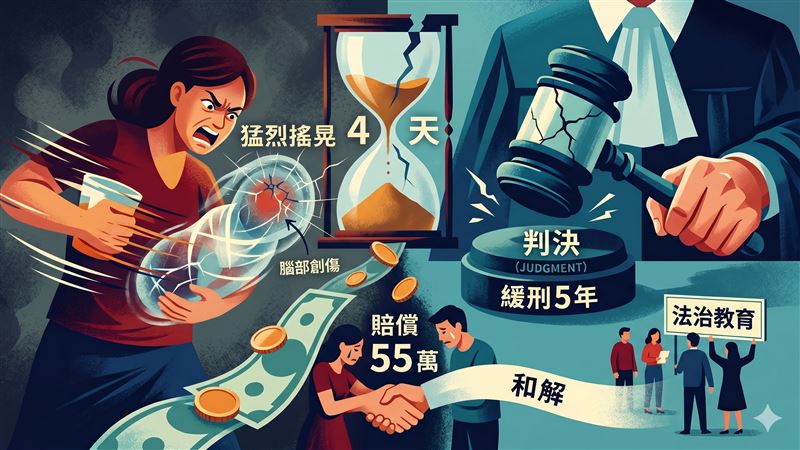 高雄一名領有專業證照的蕭姓資深保母,2025年間受委託照顧一名男嬰,沒想到這名男嬰才剛送托短短4天,蕭女竟因受不了孩子哭鬧,情緒失控下將男嬰當成「手搖飲」般瘋狂猛甩,導致孩子顱骨骨折、視網膜出血,傷勢相當嚴重,案經橋頭地院審理後,考量蕭女賠償55萬元達成和解,依傷害罪判刑1年8月,緩刑5年,全案可上訴。