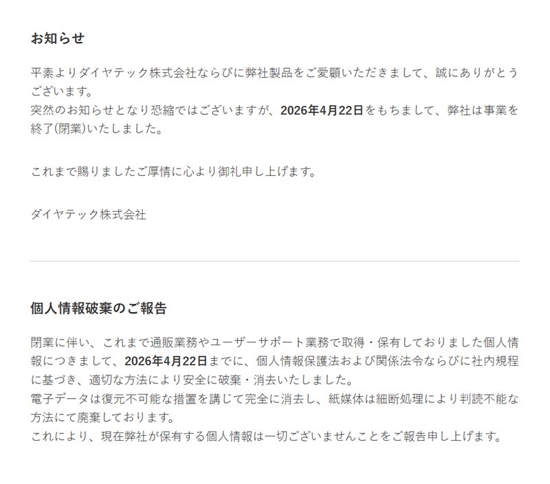 根據Diatec(ダイヤテック株式会社)官方網站所發布之聲明指出,該企業感謝消費者長年的愛護,宣告結束所有業務營運,但並未對外具體說明關門緣由。為防範顧客隱私外流,官方強調已依據日本個資法規,於停業當日運用不可逆之技術抹除數位網購紀錄,並全數銷毀實體紙本建檔。