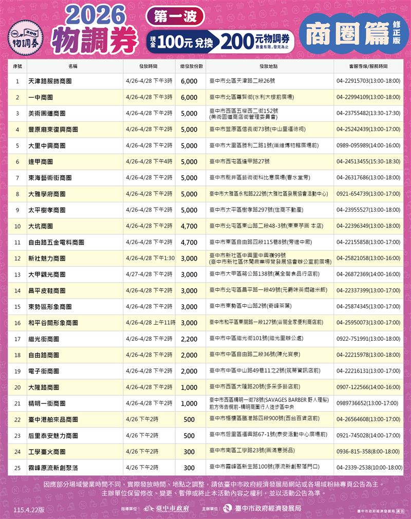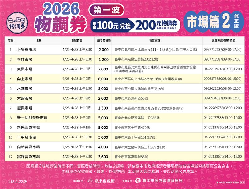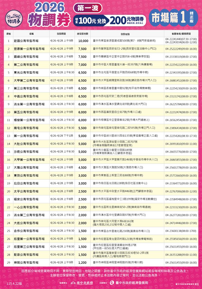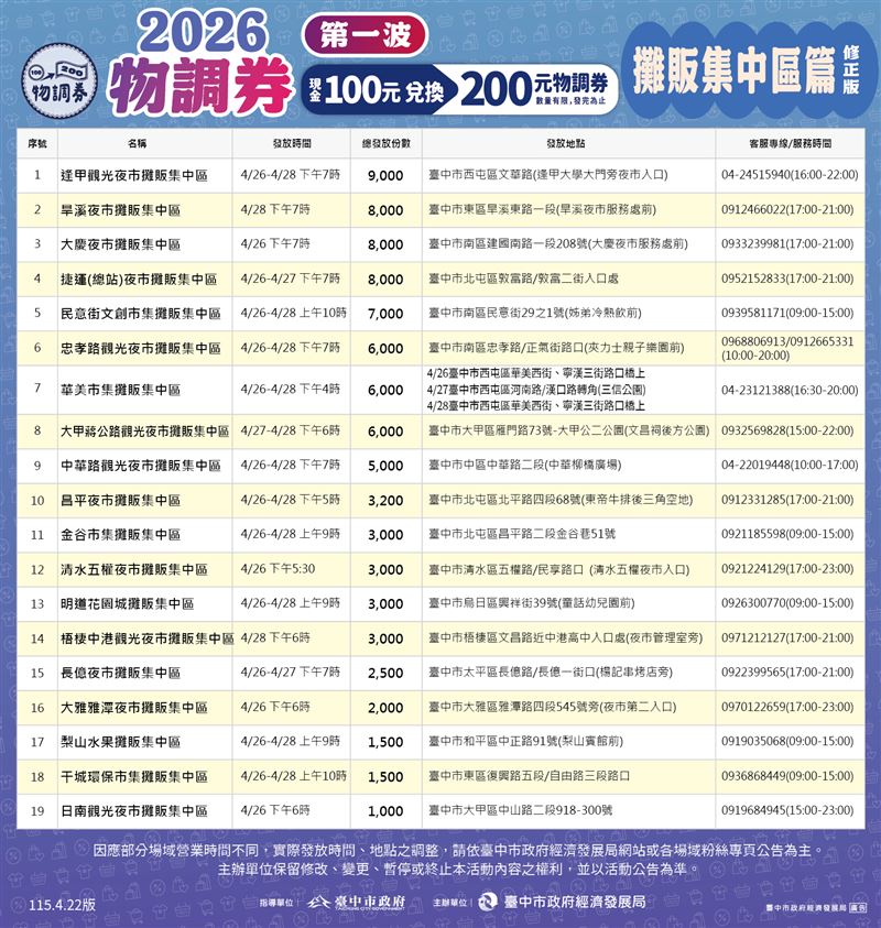 台中市經發局指出,今年物調券第一波將於4月26日至4月28日發放,共計發放35萬份,發放地點在台中市公有市場、民有市場、公有委外市場、民營市場、攤販集中區、商圈,以及台中市產業故事館發展協會所屬會員店家發放,總計107處場域。