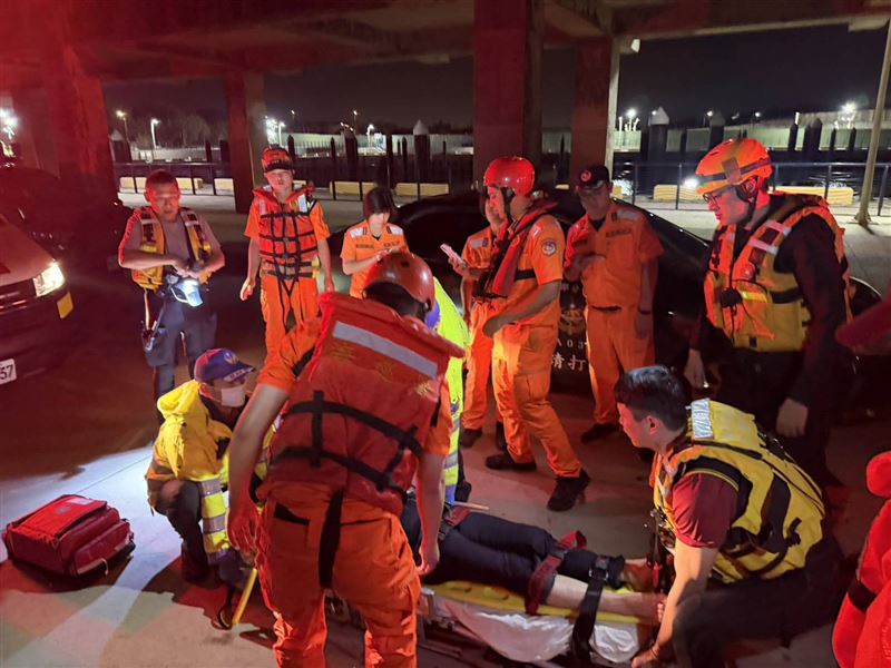 海巡署北部分署第八岸巡隊竹圍安檢所今日凌晨2時,值班人員透過港區監視系統及敏銳的觀察力,主動發現竹圍漁港卸貨區有1名女子落海,立即通報留守主官召集所內人員,派遣2車7人趕赴現場救援,同時回報第三巡防區指揮部統合轄區救援能量,啟動救援機制,並通報桃園市政府消防局第三大隊竹圍分隊及桃園市政府警察局大園分局竹圍派出所派員支援。
