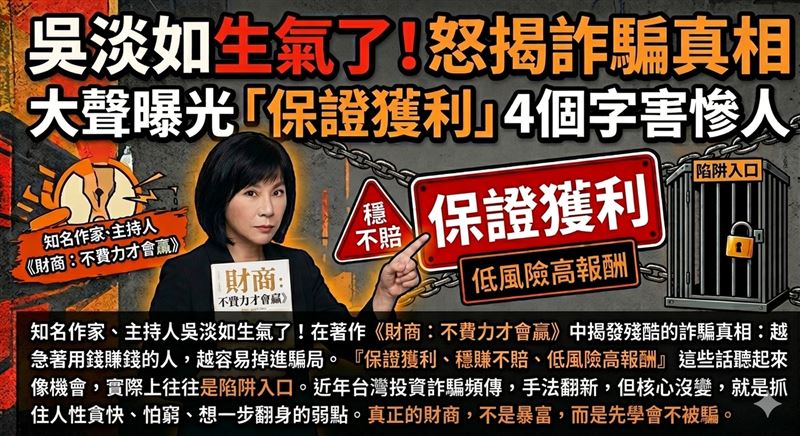 知名作家、主持人吳淡如生氣了!在著作《財商:不費力才會贏》中揭發殘酷的詐騙真相:越急著用錢賺錢的人,越容易掉進騙局。「保證獲利、穩賺不賠、低風險高報酬」這些話聽起來像機會,實際上往往是陷阱入口。近年台灣投資詐騙頻傳,從虛擬貨幣到假募資案,手法翻新,但核心沒變,就是抓住人性貪快、怕窮、想一步翻身的弱點。真正的財商,不是暴富,而是先學會不被騙。