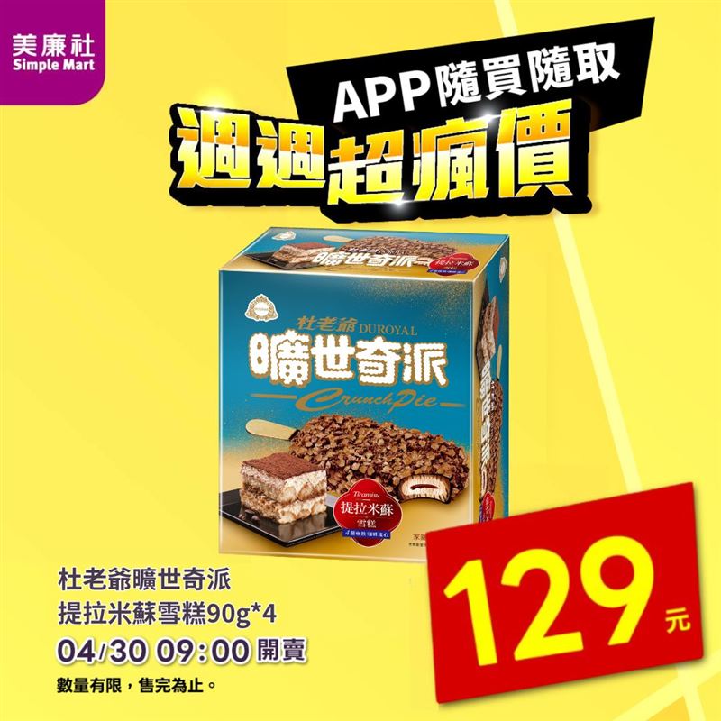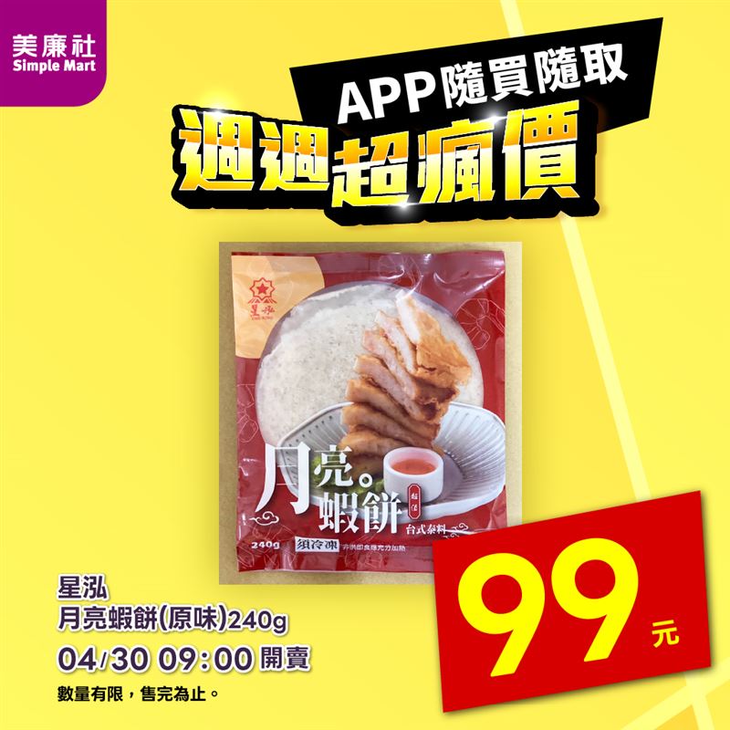 美廉社APP每週四推出「週週超瘋價」!上桌直接秒殺的「星泓月亮蝦餅(原味)」(240g),現在一件只要99元;大人系甜點「杜老爺曠世奇派提拉米蘇雪糕(4入)」(90g)現在一件只要129元!4月30日上午9:00起在美廉社APP隨買隨取開賣,會員各限購1組,數量有限,售完為止。